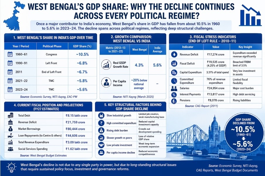 Bengal’s GDP share decline is structural, driven by industrial slowdown, fiscal constraints, slower growth, and weak private investment—not any single party.