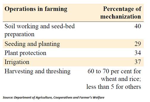 The overall level of mechanization in farming is below 50 per cent in the case of majority of the farming operations in India.