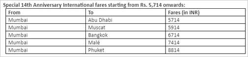 GoAir currently operates over 325 daily flights around the globe.GoAir is offering flight tickets from Rs 1,714 to mark its 14th anniversary. The domestic airline has said that the fares on its fresh sale will end with "14" as the last two digits across all its 33 destinations. The non-stop GoAir flights from Mumbai can be availed for Rs 1,714 (all inclusive) on the domestic routes and Rs 5,714 (all inclusive) on international routes.
