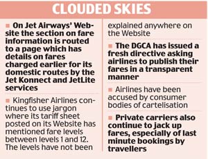Another leading carrier, Kingfisher Airlines too, continues to use jargon where its tariff sheet posted on its Website has mentioned fare levels between levels 1 and 12. The levels has not been explained anywhere in the Website. The airline has largely tinkered with lucrative sectors, especially Delhi- Mumbai, which is not in chronology, testing the patience of viewers.
