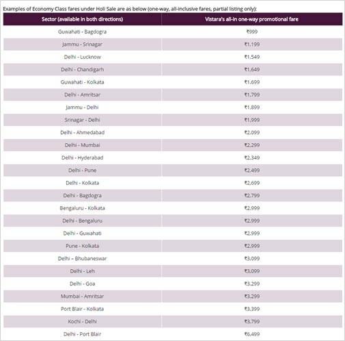 Vistara airline, a joint venture between Tata Sons and Singapore Airlines, is offering fares starting Rs 999 on the occasion of Holi festival.