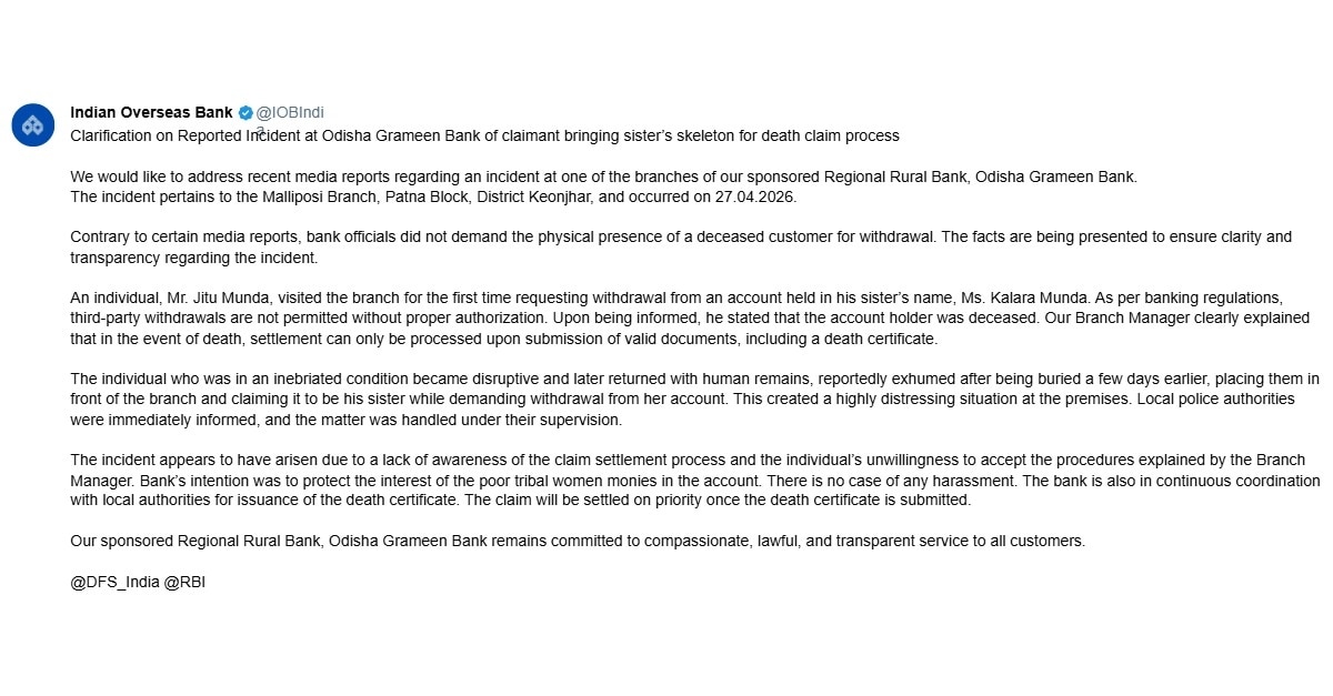 The bank said the incident took place on April 27 at the Malliposi branch of Odisha Grameen Bank in Patna Block of Keonjhar district. "Contrary to certain media reports, bank officials did not demand the physical presence of a deceased customer for withdrawal," the bank said.