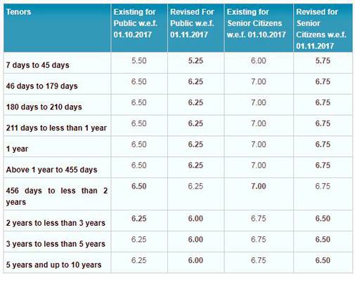 State Bank of India (SBI), the country's biggest lender has cut interest rates on fixed deposits (FDs) by 25 basis points for deposits below Rs 1 crore. The revised interest rate, that is applicable for fixed deposits across all maturities, becomes effective from November 1. So a one-year maturity will now fetch 6.25 per cent interest against 6.50 per cent earlier. Senior citizens too have the bear the brunt of 25 basis point cut. A one-year FD that used to fetch senior citizens 7 per cent will earn them just 6.75 per cent.