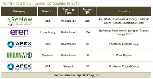 The top VC funded company in 2015 was ReNew Power Ventures, an independent power producer, which raised $265 million. (Photo: Reuters)Total global corporate funding raised by public companies in the wind sector shot up to $15.4 billion, compared to $11.8 billion in 2014, according to a report by Mercom Capital Group. This includes venture capital/private equity (VC/PE), debt financing and public market financing. Global VC investments rose to $520 million in 14 deals in 2015, compared to $311 million in 15 deals in 2014. Wind downstream companies accounted for most of the VC funding with $505 million of the $520 million raised.