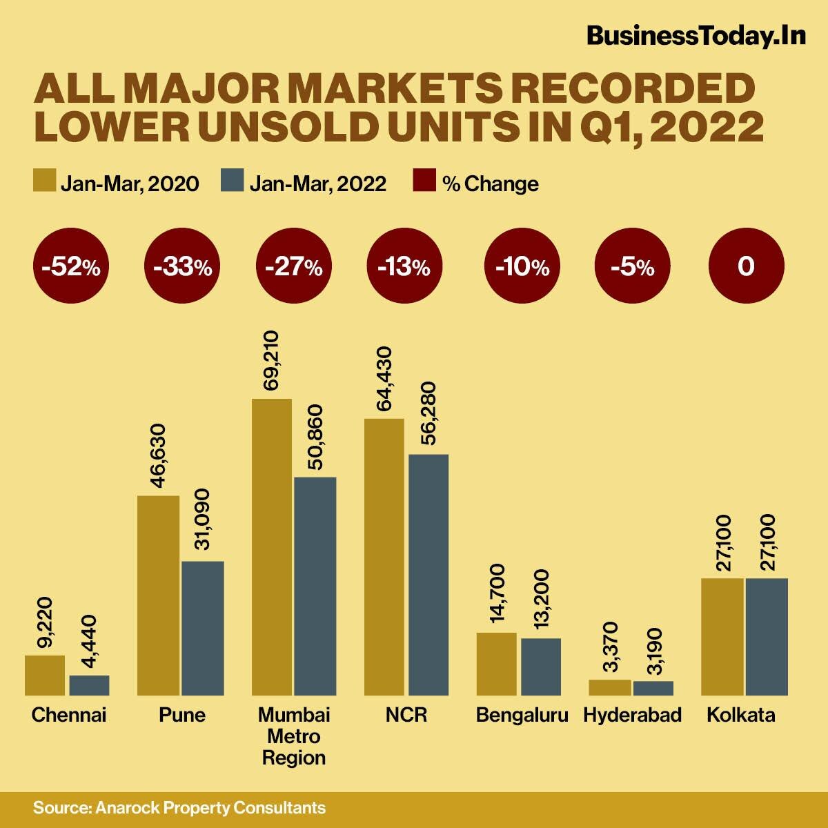 Among the top markets, Chennai recorded the highest fall - 52 per cent in the last two years, followed by Pune (33 per cent), Mumbai Metro Region (27 per cent), National Capital Region (13 per cent), Bengaluru (10 per cent) and Hyderabad (5 per cent). While in Kolkata the unsold inventory remained intact.