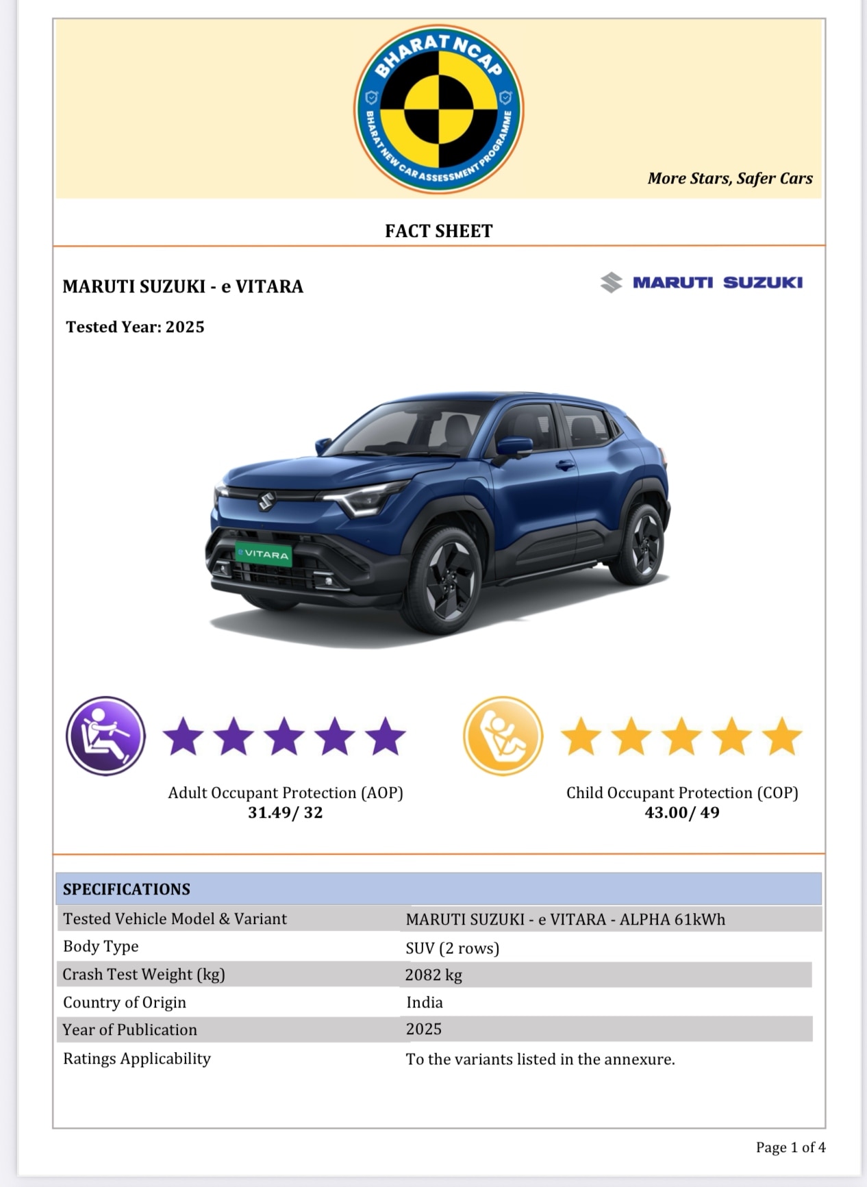 e Vitara scored 31.49 out of 32 for Adult Occupant Protection and 43 out of 49 for Child Occupant ProtectionMaruti Suzuki’s upcoming electric SUV, the Maruti Suzuki e Vitara, has delivered a strong statement on safety, achieving near-perfect crash-test scores and underlining the carmaker’s focus on safer EVs for the mass market.