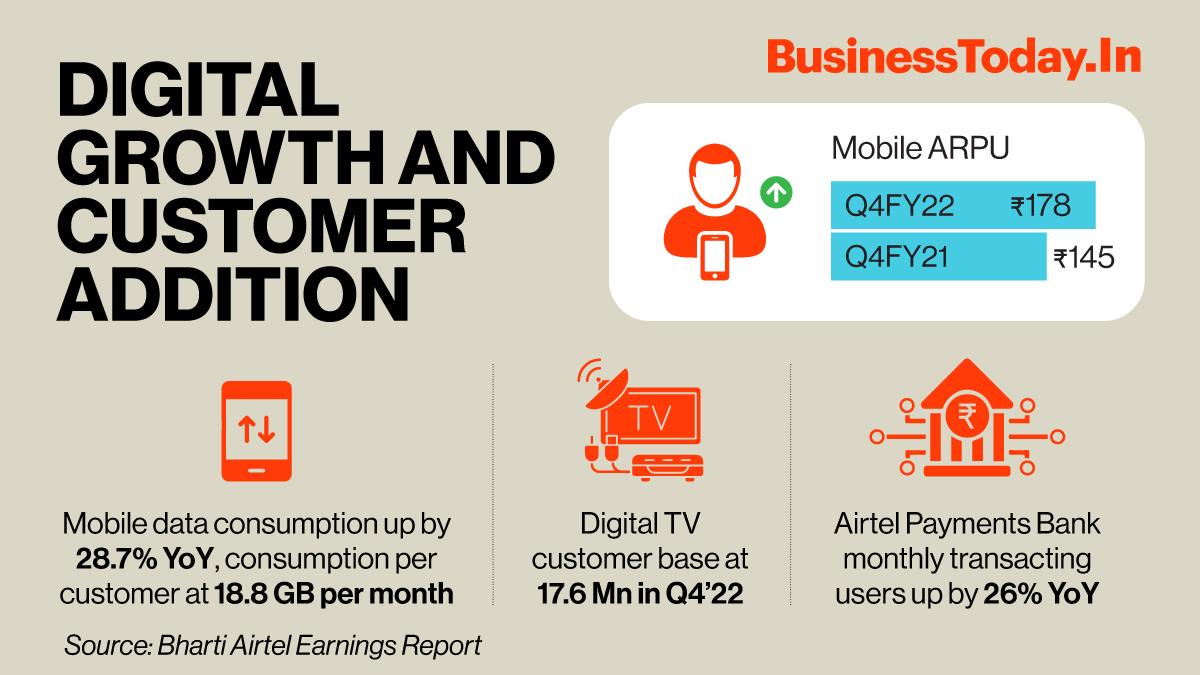 On the performance of digital growth, Airtel stated that its 4G customers were up by 21.5 million YoY and 5.2 million QoQ, crossing 200 million- mark with a 62 per cent of overall customer base.