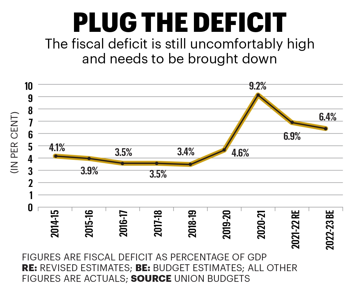 The argument, therefore, is on the mechanism to increase revenue to fund the government’s spends, instead of borrowing. Increasing taxes is the most straightforward option, but that is not easy with elections looming on the horizon. So, what else can be done? “We expect tax buoyancy to moderate in FY23 and FY24, implying that gross tax revenue growth is likely to be in line with nominal GDP growth,” says Nayar of ICRA. “In such a scenario, the government could focus on garnering additional revenues from other sources such as asset sales and monetisation. Besides, it should also limit growth in revenue expenditure, thereby curtailing the revenue deficit, while continuing to focus on growth-supportive capex.”