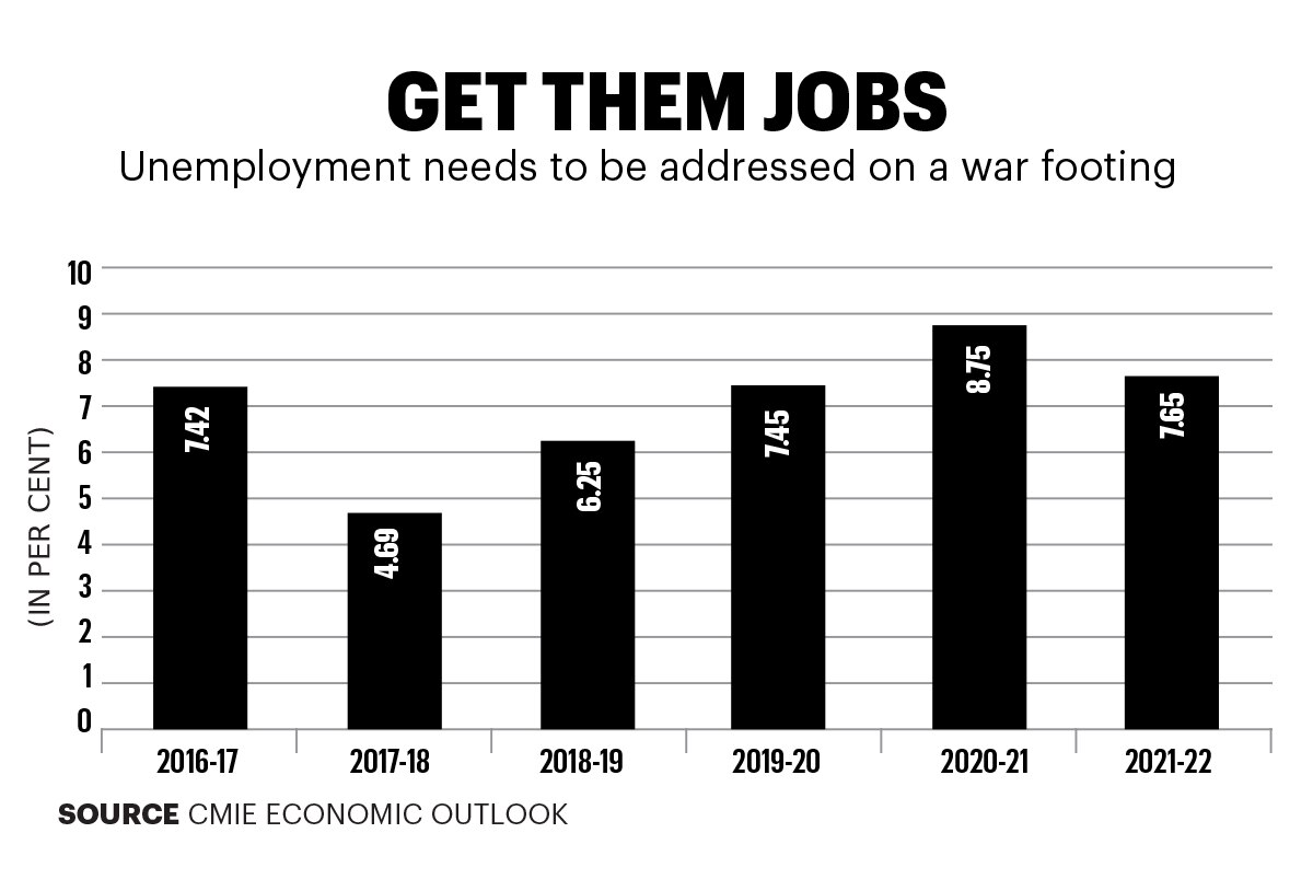 The top priority before the government is to steady India’s slowing GDP growth. In 2016-17, GDP grew 8.3 per cent, and the next three years saw that sliding to 8 per cent, 6.5 per cent and 3.7 per cent, respectively. In FY21, GDP contracted 6.6 per cent because of Covid-19, and bounced back to a strong 8.7 per cent in FY22. This was partly because of the contracted low base of FY21, bur more because of the explosion of pent-up demand after the lockdowns got over, with the absolute GDP reaching a record Rs 147.4 lakh crore (approximately $1.84 trillion). But in FY23, growth is expected to moderate. India’s National Statistical Office (NSO) predicted 7 per cent GDP growth in FY23, while other agencies have predicted anything between 6.5 and 7 per cent. And while the NSO has pegged FY24 growth at 6 per cent, others have largely kept it around 5 and 6 per cent. Nomura’s estimate, for instance, is 5.1 per cent.