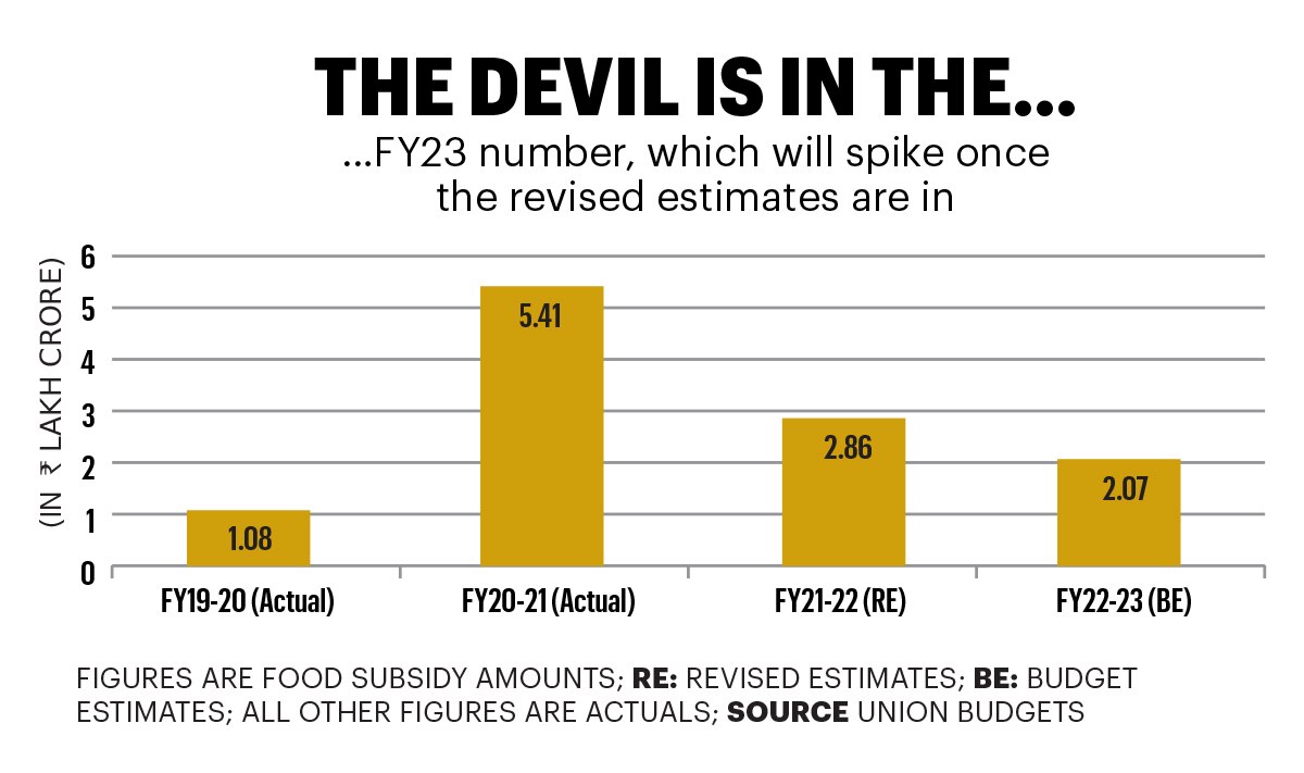 The overall subsidies in FY23—including for food, fuel and fertilisers—have shot up significantly because of inflation. In fact, he government recently had to take approval from Parliament for gross additional expenditure of Rs 4.36 lakh crore—towards various subsidies including for food and fertilisers, and the key rural job scheme, the Mahatma Gandhi National Rural Employment Guarantee Scheme or MGNREGA—of which more than Rs 3.25 lakh crore would be cash outgo, and the rest would be funded through savings of ministries or enhanced receipts. As result, the budgeted subsidy for FY23 of Rs 3.18 lakh crore—of which Rs 2.07 lakh crore is for food—is likely to shoot up big-time, perhaps even double.
