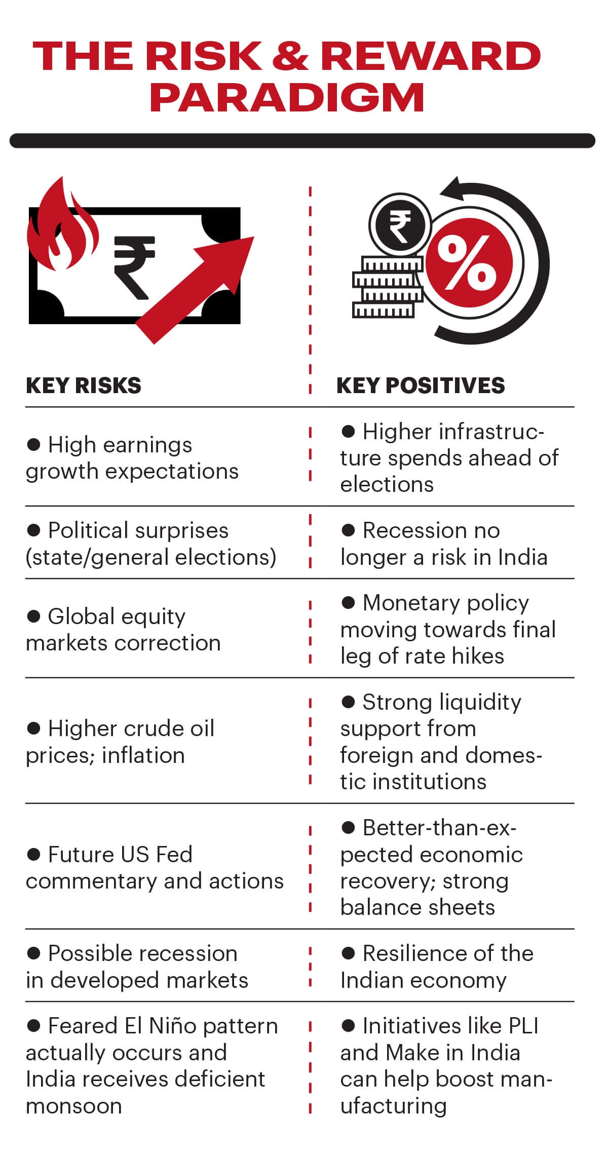 Interestingly, there is a silver lining associated with the electoral risk in terms of the government’s enhanced focus on infrastructure spending to brush up its credentials before the elections. “Calendar year 2023 is a pre-election year. It has been observed that benchmark indices perform relatively well in the pre-election years… Support could continue from the government, which is keen to stimulate investment activity in newer sectors,” says Jasani of HDFC Securities. He adds that initiatives like the PLI scheme can help boost manufacturing by wresting some supply chains away from China, propel exports, and attract rapidly-growing industries like semiconductors, electric vehicles and renewables that are of strategic geopolitical importance.