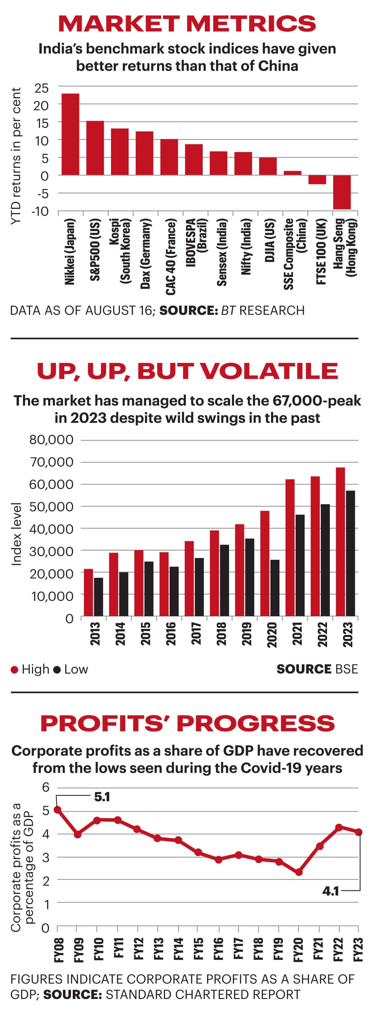 When the benchmark BSE Sensex touched its all-time high of 67,619.17 on July 20, it had rallied a little over 11 per cent, compared to its 2022 close. More importantly, it had surged nearly 18.5 per cent from its low of 57,084.91 touched earlier this year. At its peak, it was among the best performing equity benchmark indices globally, though the ensuing correction has brought it to the middle of the pack.