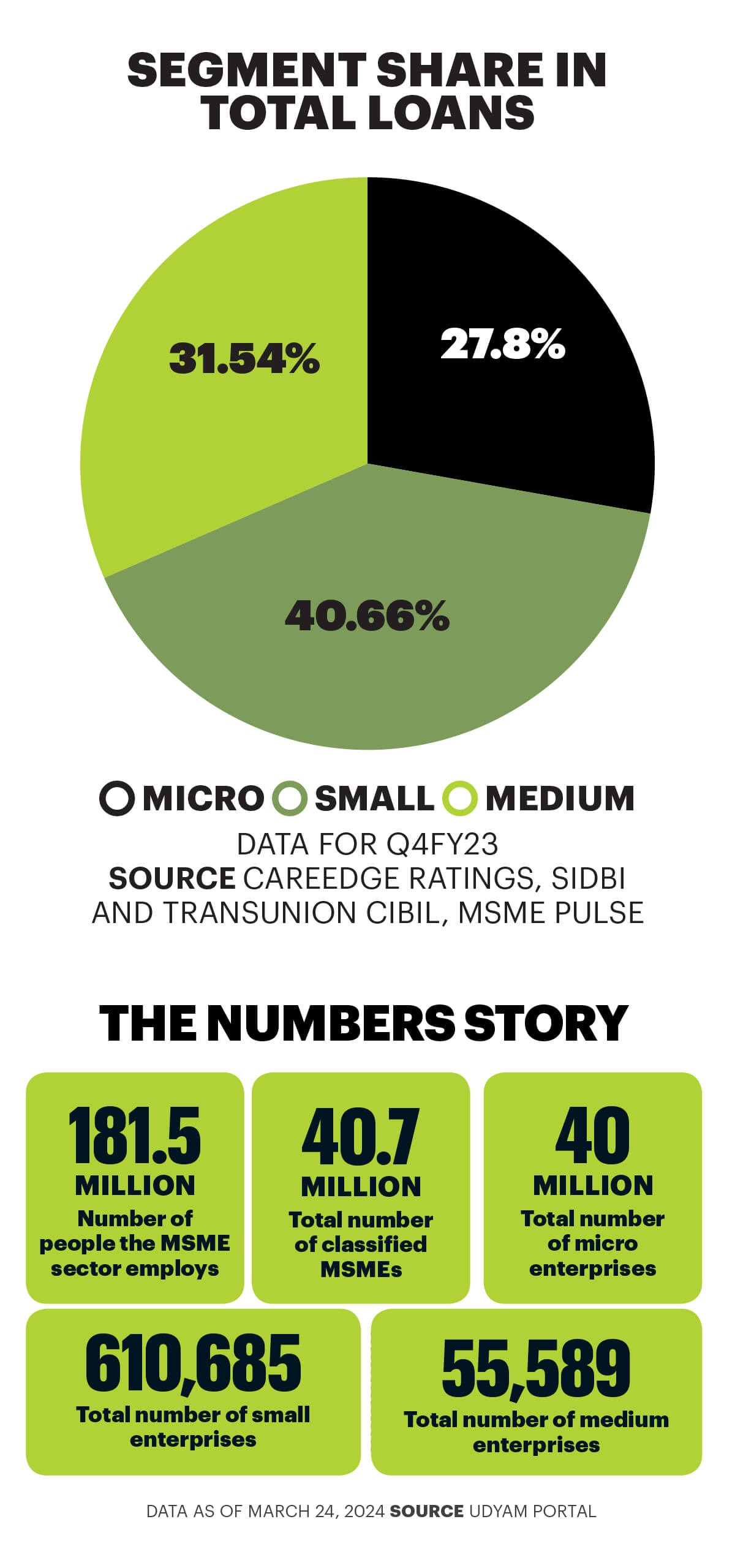 At a recent webinar, CareEdge Ratings summed up the major stumbling blocks for MSMEs in accessing formal credit: requirement for collateral, lack of credit history and financial record, the seasonal nature of business of MSMEs, and the lack of awareness and financial literacy. CareEdge’s Agarwal notes that gross NPAs for MSMEs is at an all-time low. “As more data becomes available on MSME borrowers, the comfort of lenders will increase… Due to repayment data available with credit bureaus, MSME borrowers are also becoming more careful in making timely payments,” he says. The quality of banks’ MSME portfolio has shown improvement with gross NPAs declining to 4.7% in September 2023 from 7.7% a year earlier. Shachindra Nath, Founder and MD of U GRO Capital, an MSME lending-focussed fintech, adds that as formalisation of the sector continues and companies have more data and the ability to collate it, credit to the sector will increase. “The next 10 years could be the golden age of MSMEs and with the right credit financing, they could contribute as much as 40% to the GDP.”