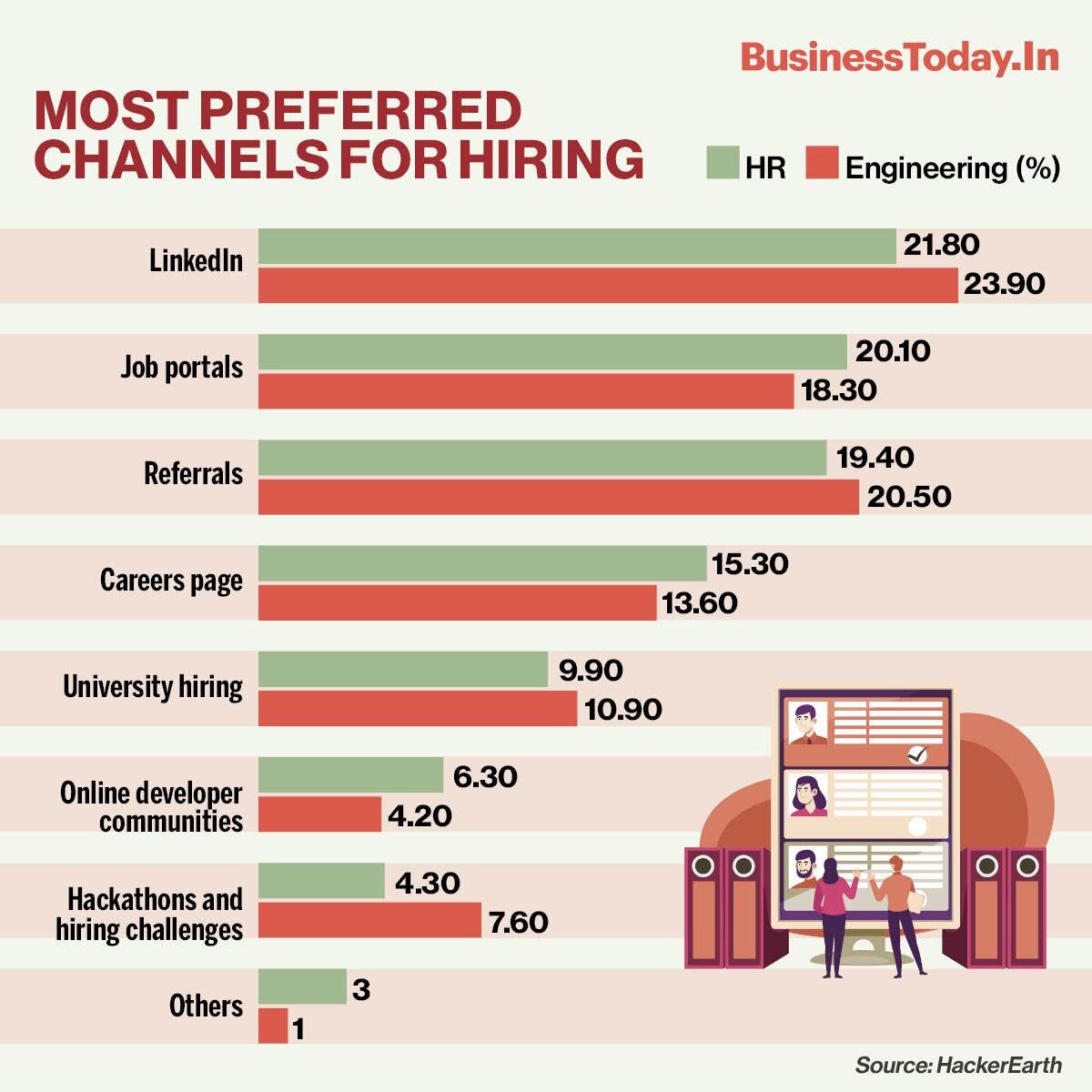 Traditional channels like LinkedIn, job portals, referrals, careers page and university hiring are still the main sources for HR professionals and engineering managers to onboard candidates. Developer communities and hackathons are good for sourcing according to engineers more than it is for recruiters.