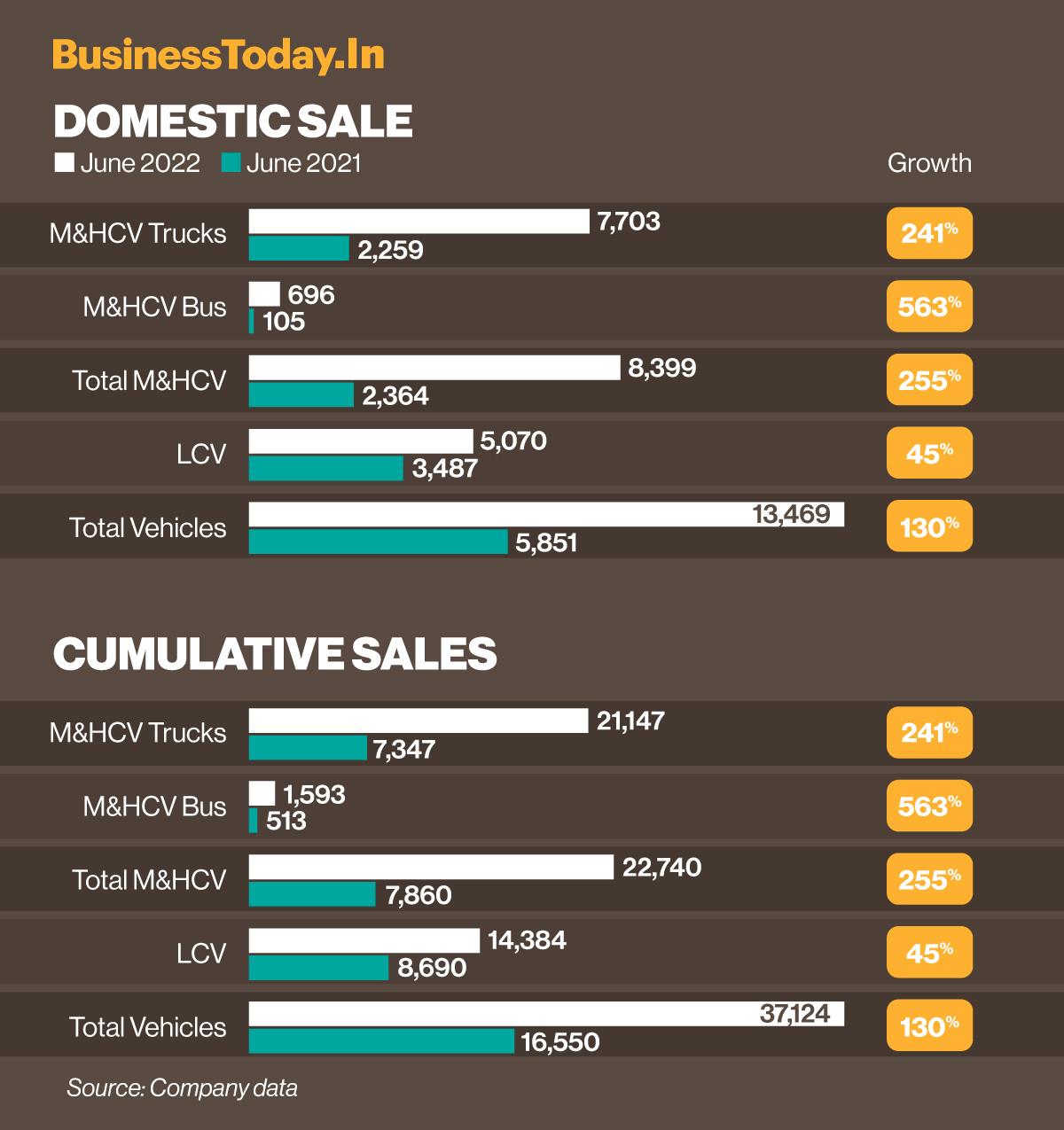 The company, in a public statement, also revealed that its total sales of medium & heavy commercial vehicles (M&HCVs) surged 255 per cent to 8,399 units in June 2022.