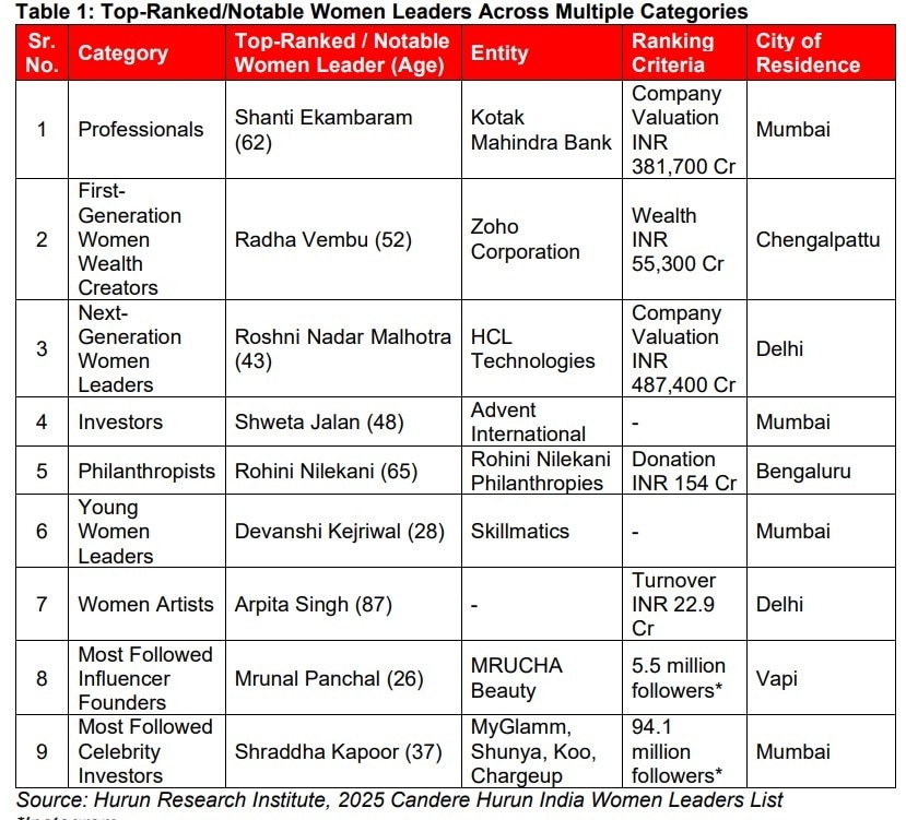 The list, a joint effort by Candere and Hurun India, spotlights 97 exceptional women across five foundational pillars—Wealth Creation, Value Creation, Philanthropy, Start-ups, and Culture. Among the standout names joining Ekambaram in the professionals category are several top-ranking leaders who collectively represent over Rs 11.7 lakh crore in enterprise value.