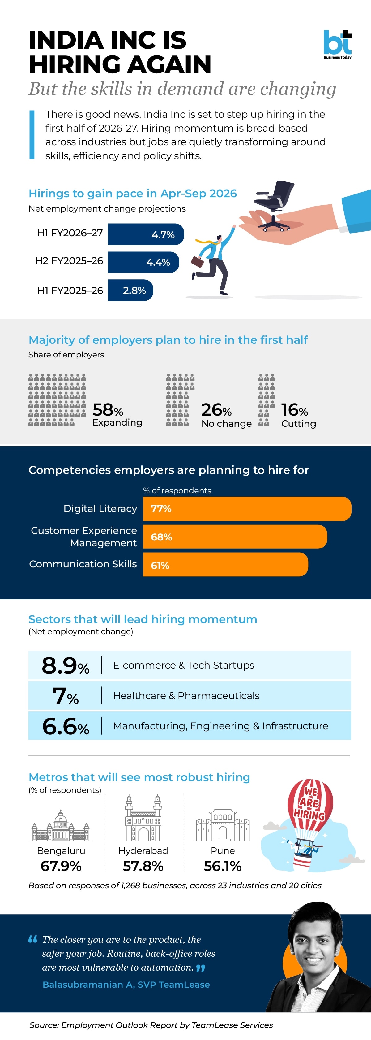 “India’s workforce dynamics are increasingly being shaped by structural and policy-led shifts rather than cyclical demand. Businesses are recalibrating workforce models to align with new statutory frameworks, moving towards disciplined, efficiency-led strategies that prioritise long-term sustainability over short-term expansion,” explains Balasubramanian A, Senior Vice President, TeamLease Services. This transition is also reflected in who is driving growth. Large enterprises (74%) are leading workforce expansion, compared to 57% of mid-sized firms and 38% of small businesses, pointing to a scale-led recovery employment growth.
