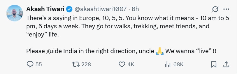 A fourth user said: "There's a saying in Europe, 10, 5, 5. You know what it means - 10 am to 5 pm, 5 days a week. They go for walks, trekking, meet friends, and 'enjoy' life. Please guide India in the right direction, uncle. We wanna 'live'!!"