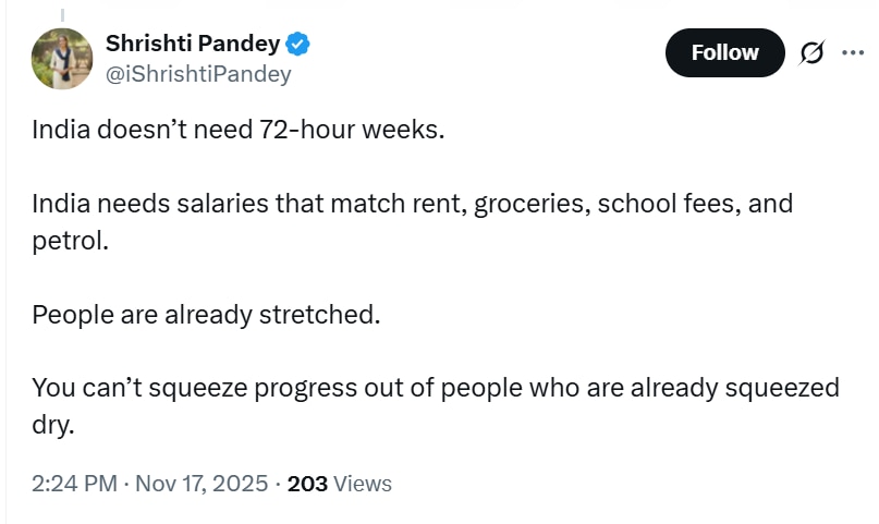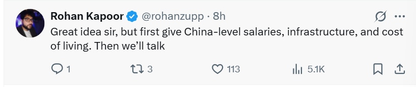"Great idea sir, but first give China-level salaries, infrastructure, and cost of living. Then we’ll talk," a user said. A second user weighed in: "India doesn't need 72-hour weeks. India needs salaries that match rent, groceries, school fees, and petrol. People are already stretched. You can't squeeze progress out of people who are already squeezed dry."
