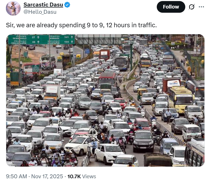 "Sir, we are already spending 9 to 9, 12 hours in traffic," a third user commented.