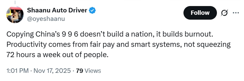 "Copying China’s 9 9 6 doesn’t build a nation, it builds burnout. Productivity comes from fair pay and smart systems, not squeezing 72 hours a week out of people," yet another user commented.