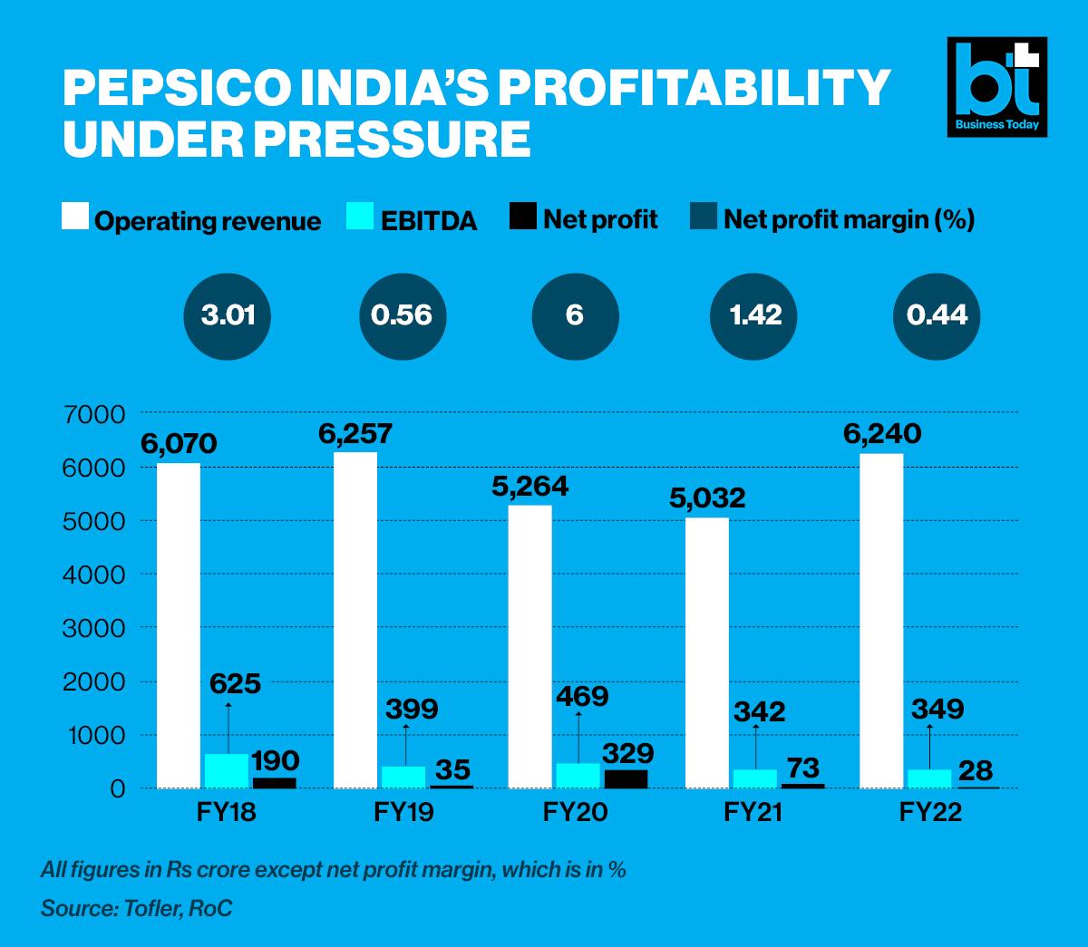 Revenue for the beverages major is up by 24 per cent. Company attributes higher expenses to commodity inflation and increased spends on advertising and marketingFoods and beverages major PepsiCo India Holdings has registered a steep 62 per cent fall in its net profit for FY22. From Rs 73 crore in the previous fiscal, it dropped to Rs 28 crore. This is even as total operating revenue was up by 24 per cent from Rs 5,032 crore to Rs 6,240 crore, according to the company’s annual report filed with the Registrar of Companies (RoC) and a detailed financial analysis sourced from research platform, Tofler.