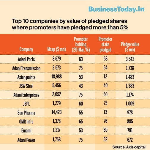 Adani Ports, Adani Transmission, Asian Paints, JSW Steel, Adani Enterprise, JSPL, Sun Pharma, GMR Infra, Emami and Adani Power are the top ten companies in pledge value, the report said.