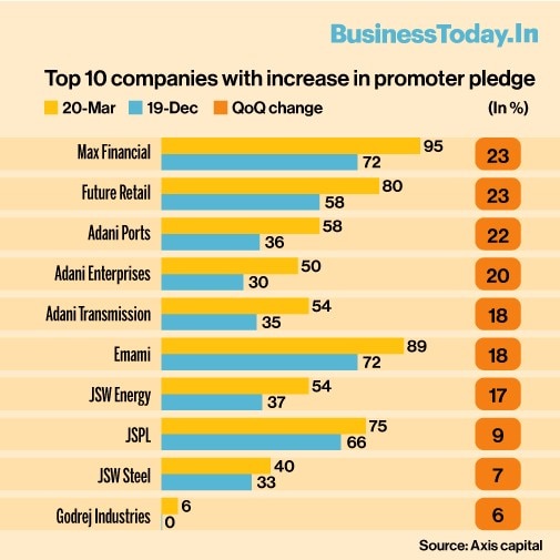 Adani Enterprises, Adani Ports, Adani Transmission, Emami, Future Retail, Godrej Inds, JSPL, JSW Energy, JSW Steel and Max Financial are the top ten firms with increase in promoter pledge sequentially.