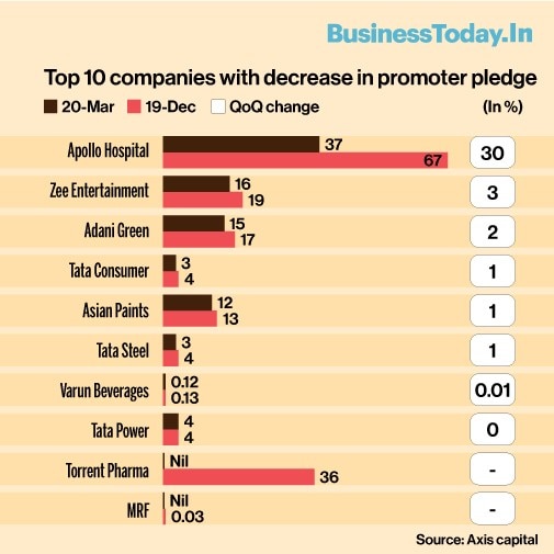 The top ten companies with decrease in promoter pledge Q-o-Q include Adani Green, Apollo Hospitals, Asian Paints, MRF, Tata Consumer, Tata Power, Tata Steel, Torrent Pharma, Varun Beverages and Zee Entertainment.