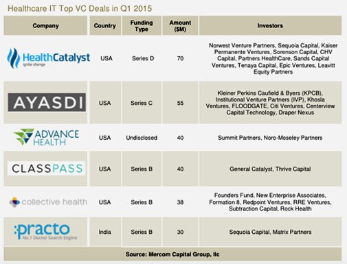 In India, Practo, a developer of a physician search engine to book appointments and rate providers, raising $30 million was the biggest funding in Q1 of 2015. Another notable VC deal in India was eKincare, an online and offline platform owned by Aayuv Technologies that enables users to monitor their critical medical information and access it anywhere anytime, raising $300,000 (Rs 1.86 crore) in seed funding from BitChemy Ventures and Adroitent. Gympik.com, an online search engine that allows users to search and rate fitness facilities and professionals, raised $135,000 (Rs 86 Lacks) in seed funding from Capvent's managing partners Tom Clausen and Rohan Ajila, as well as manufacturing firm Haldyn Glass.