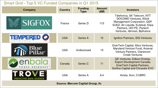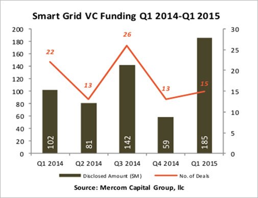 Venture capital funding in the smart grid sector soared to $185 million across 15 deals in the first quarter of 2015, according to a report by Mercom Capital Group, a global clean energy communications and consulting firm. The figure in the previous quarter stood at just $59 million across 13 deals.