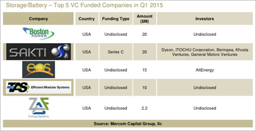 The battery/storage companies raised $69 million in Q1, 2015 in seven deals, compared with $47 million in Q4, 2014. The two top deals both raised at $20 million, by Boston Power and Sakti3 respectively. There were five M&A transactions in the battery/storage category- the only two disclosed transactions added up to $2.3 billion.
