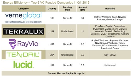 VC funding for the efficiency sector in Q1 2015 was $140 million across 15 deals. That compares with $192 million across 25 deals in the previous quarter. Verne Global, a developer of energy efficient data centres, raised $98 million in the biggest deal in the space.