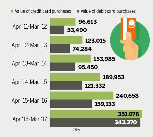 For the first time, debit card purchases are now higher than credit card purchases, spurred in part by the drive to a cashless economy following demonetisation last year. For the first six months of the current fiscal, debit card purchases totaled Rs 218,778 cr while purchases through credit cards were Rs 212,461 cr.