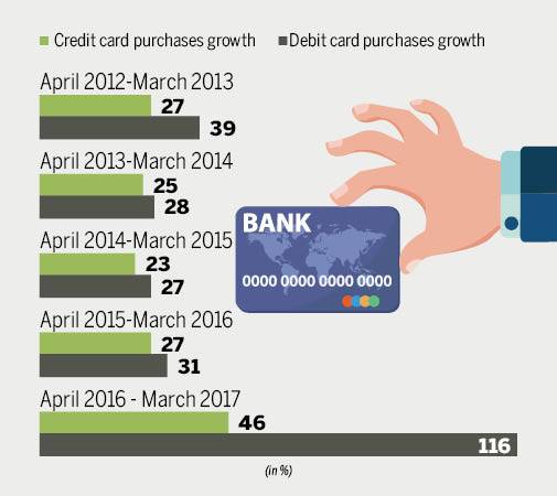 Debit card purchases growth rate more than doubled last fiscal, as demonetisation propelled the move to a cashless economy.