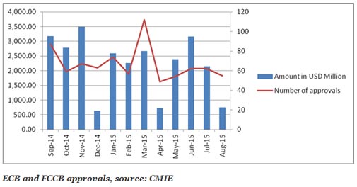 On a cumulative basis, during April-August 2015, the amount raised through ECB and ECCB route fell to 14.9 per cent to $9.18 billion, year-on-year. The number of approvals declined around 8 per cent to 282 over the same period, primarily driven by the decline in the amount raised through the automatic route.