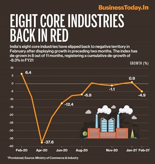 The cumulative growth during April to February, 2020-21 has been pegged at (-) 8.3 per cent, showed data released by Ministry of Commerce and Industry on Wednesday. Growth in eight core industries has remained in negative territory for eight out of 11 months of FY21. While the first three post-lockdown months - April, May and June - recorded double-digit declines, the trend was showing signs of revival with marginal growth in January and December. The decline in growth during February is a distressing development.