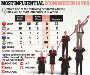 In fact, they are pipped to the post - at least on the optimism front - only by the Chinese. In the first ever Harris Poll in Asia, the attitudinal economic outlook regarding China is very similar among adults in both China and India, with 85 per cent of Chinese saying that China will be the most influential economy in the next ten years, compared to 80 per cent in India.