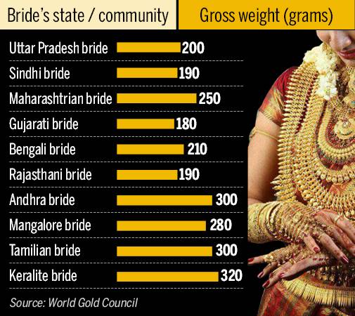 Of course, no prizes for guessing which bride comes laden with the most gold - an average Malayalee upper middle class bride will have nearly twice as much gold on her than her Gujarati counterpart.