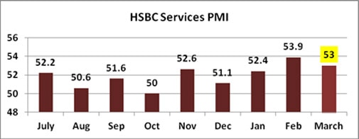 The services sector contributes more than half of India's GDP. Growth in the services sector is considered as an indicator for the country's overall economic progress. (Photo: Reuters)Growth in the country's services sector slowed in March, with the HSBC India Services Purchasing Managers' Index (PMI) easing to 53 from 53.90 in February.
