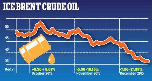Brent crude prices on Monday fell another two per cent to $36.04 per barrel, a level that was prevailing in 2004. Photo: Reuters