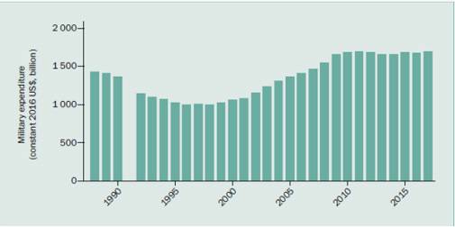 World military expenditure is estimated to have reached $1739 billion in 2017, the highest level since the end of the cold war. After 13 consecutive years of increases from 1999 to 2011 and relatively unchanged spending from 2012 to 2016, total global expenditure rose marginally in 2017, by 1.1% in real terms.