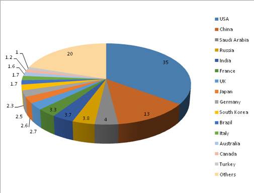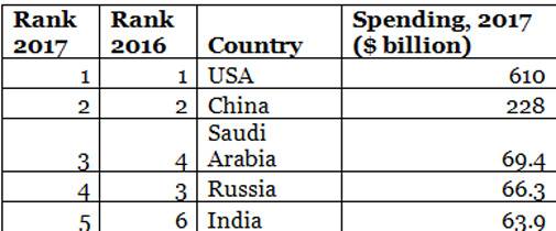 The five biggest spenders in 2017 were the United States, China, Saudi Arabia, Russia and India, which together accounted for 60% of global military spending.