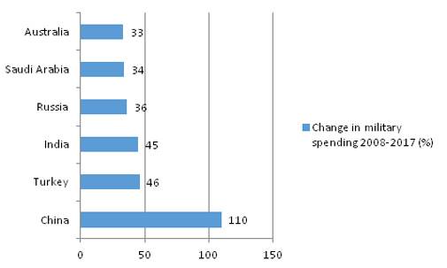 Six of the top 15 military spenders made significant increases of more than 30% in their military spending between 2008 and 2017: China, Turkey, India, Russia, Saudi Arabia and Australia.