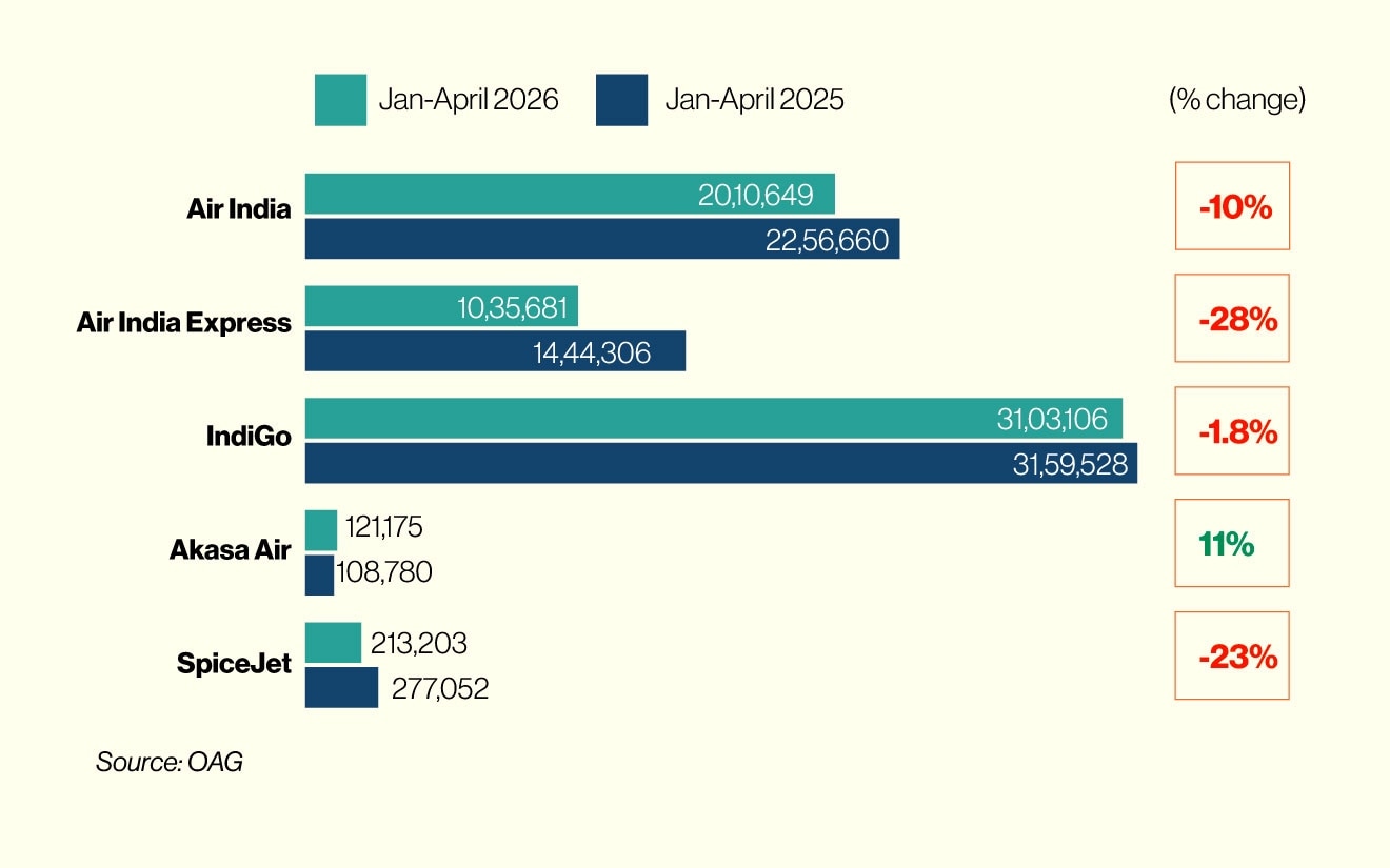 Data 1: Impact on the International seat capacity of domestic carriers (Jan-April 2026 vs Jan-April 2025) (Source: OAG)