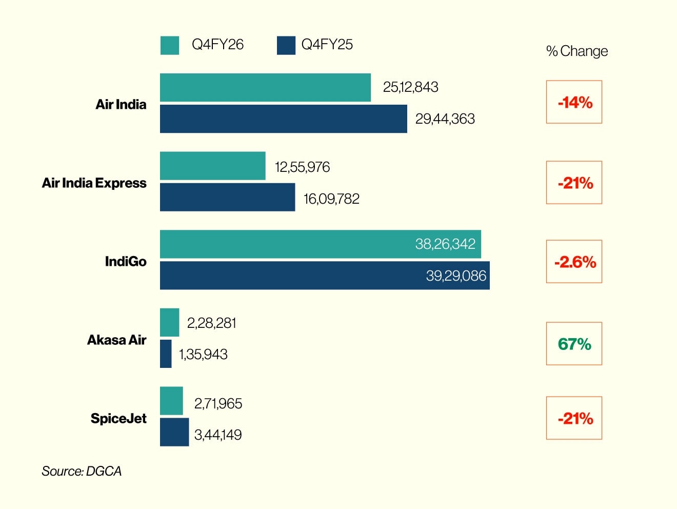 Data 4: Passengers carried by Indian domestic carriers in Q4FY26 Vs Q4FY25 (Source: DGCA)