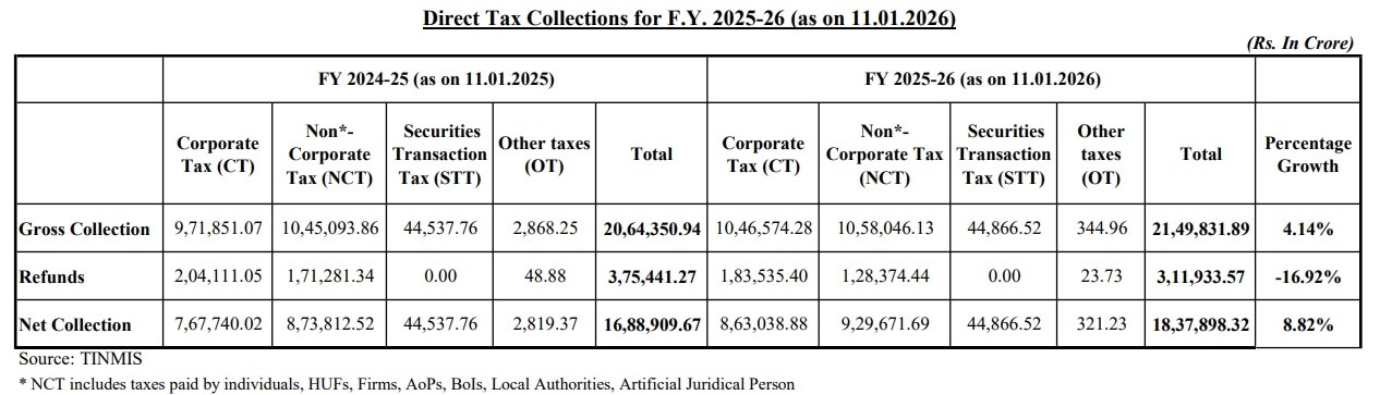 For FY26 (2025-26), the government has projected direct tax collections at ₹25.20 lakh crore, representing a growth of 12.7% over the previous year.India’s net direct tax collection grew 8.82% to over ₹18.38 lakh crore in the current financial year till January 11, according to data released by the Income Tax Department on January 12.