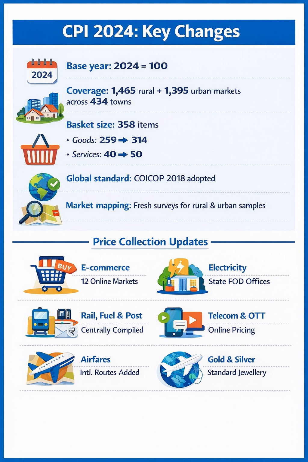 A key feature of the new framework is the inclusion of e-commerce prices. The CPI 2024 series will collect weekly price data from 12 online markets in cities with populations exceeding 25 lakh, allowing inflation data to capture digital retail behaviour more accurately.