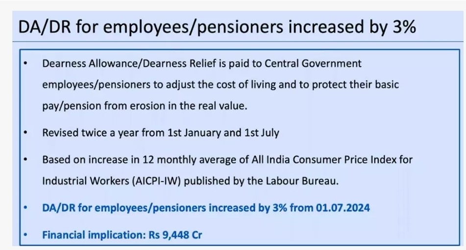 Minister Ashwini Vaishna at the Cabinet briefing today announced an increase in Dearness Allowance (DA) and Dearness Relief (DR) from 50 percent to 53 percentThe Union Cabinet on Wednesday, headed by Prime Minister Narendra Modi, increased dearness allowance (DA) by 3% for central government employees to bring the key allowance to 53% of the basic pay. Information and Broadcasting Minister Ashwini Vaishna at the Cabinet briefing today announced an increase in Dearness Allowance (DA) and Dearness Relief (DR) from 50 percent to 53 percent, effective from July 1, 2024.