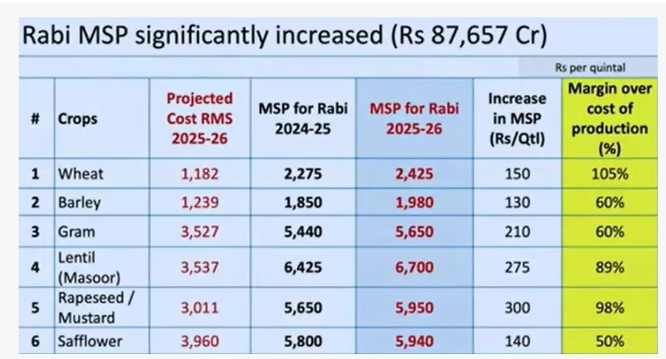 The Cabinet Committee on Economic Affairs (CCEA), chaired by the Prime Minister Narendra Modi, approved the increase in the MSP of six mandated rabi crops for 2025-26 marketing season in the range of Rs 130-300 per quintal.